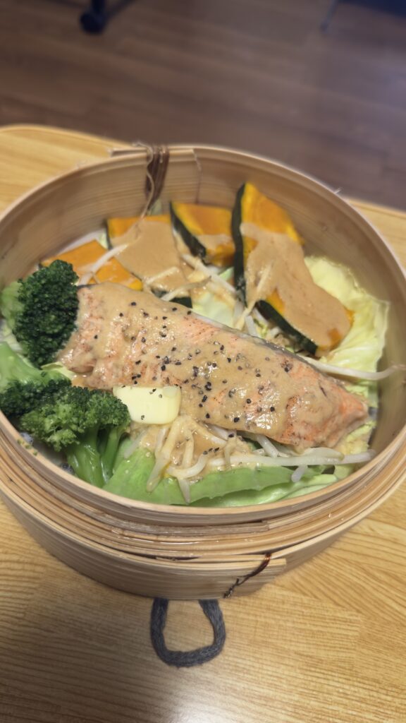 蒸した鮭はふっくらで、野菜も色鮮やかで、見た目から元気が出る一皿になりました。